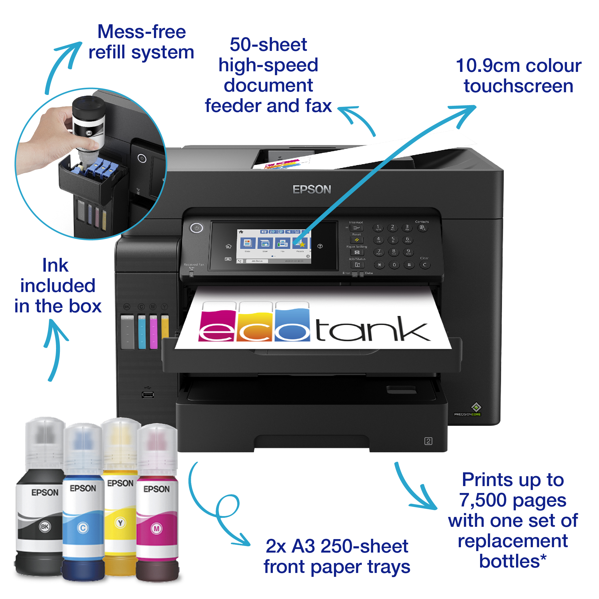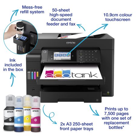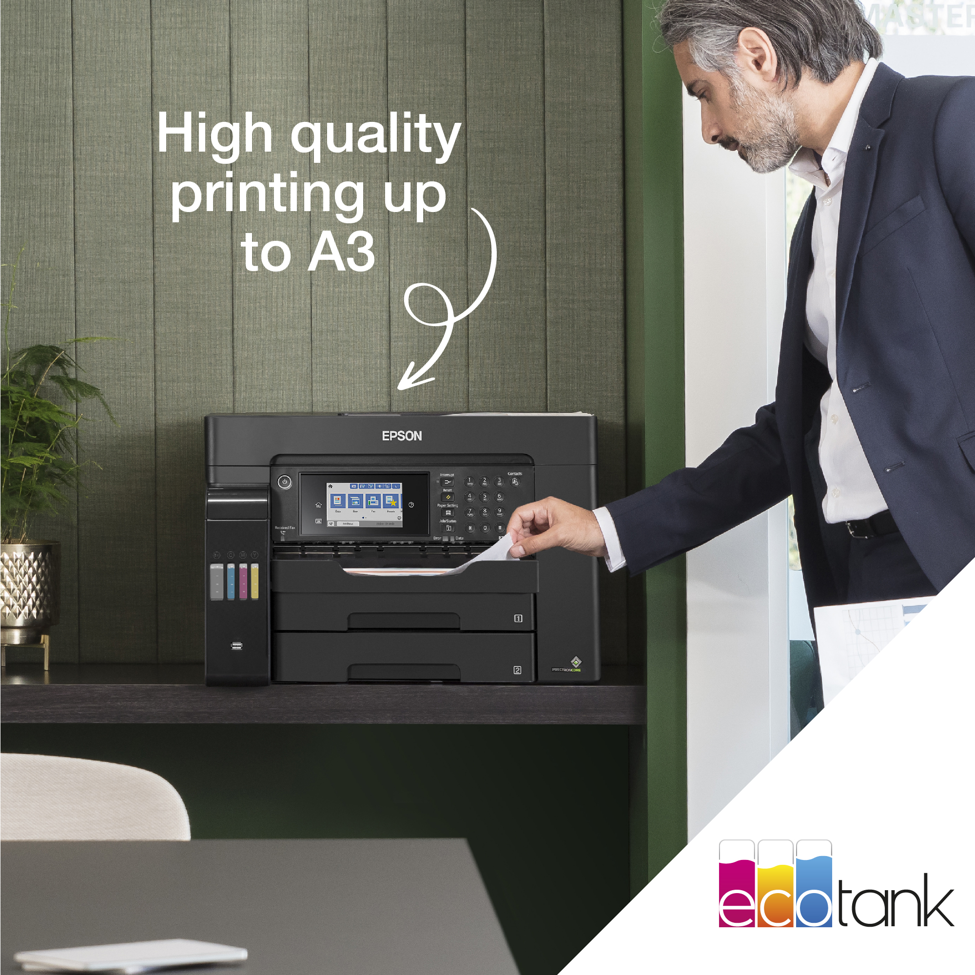 Özellik açısından zengin EcoTank, sayfa başına düşük bir maliyet sunarken A3+ görevlerini kolaylaştırır. A3+ işleri, yüksek hızlı baskı ve tarama, iki adet 250 sayfalık ön tepsi, 50 sayfalık arkadan besleme ve 50 sayfa A3 ADF sayesinde hızlı bir şekilde tamamlanabilir. Mobil baskı, Ethernet ve sabit tuşlar içeren 10,9 cm LCD dokunmatik ekran ile istediğiniz gibi baskı alın.