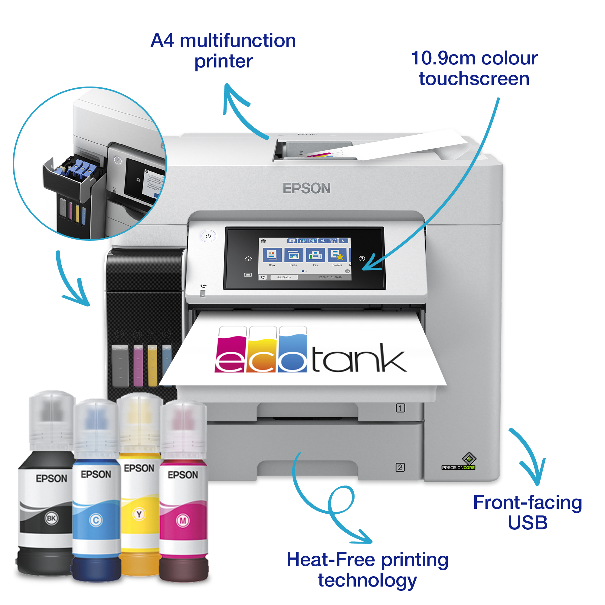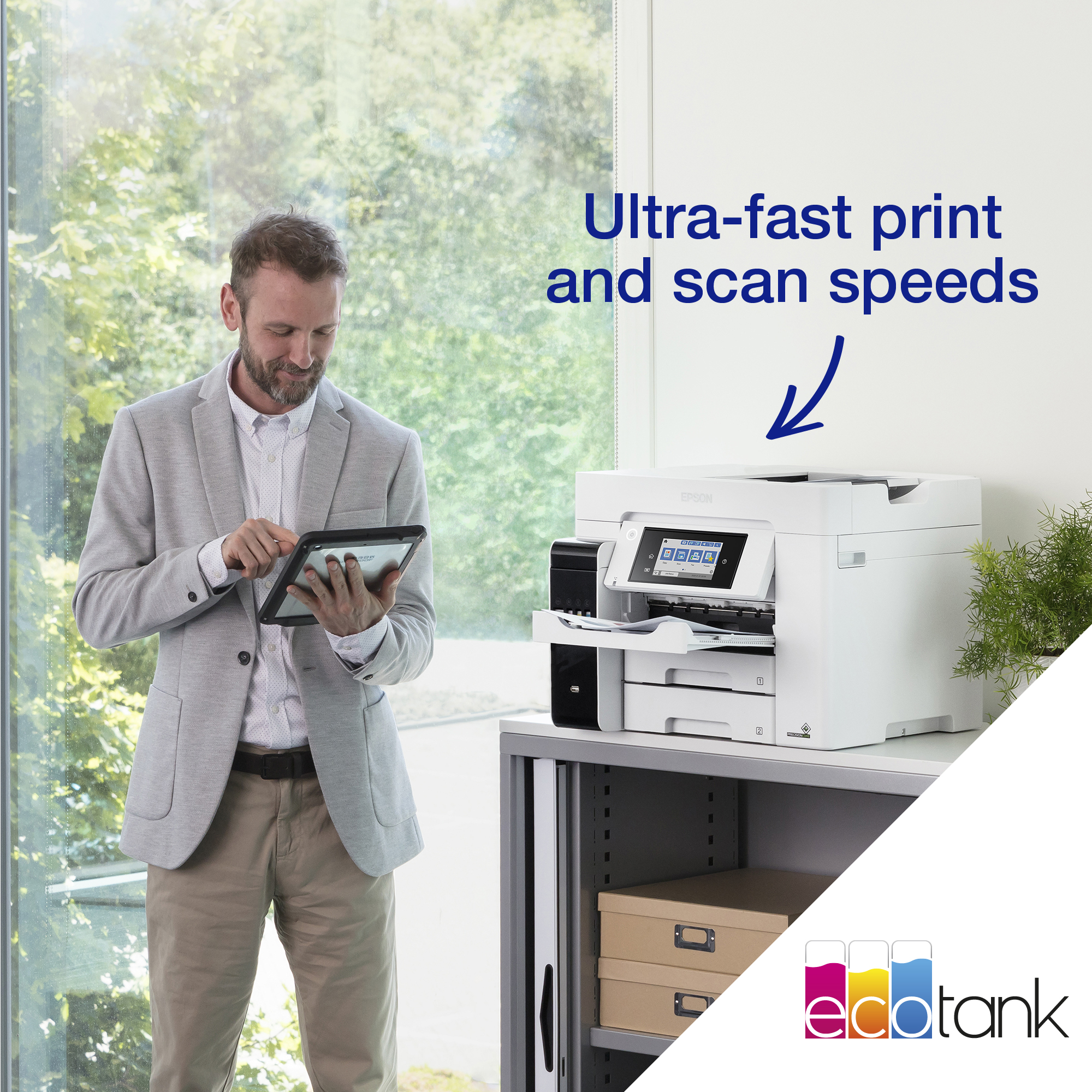 Yeniden doldurmayı en aza indiren bu EcoTank, daha fazla mürekkebe ihtiyaç duymadan binlerce sayfa baskı alabilir ve iki adet kâğıt tepsisi 500 sayfalık bir kapasite sunar. 50 sayfalık cömert arkadan besleme ve A4 ADF ile kendinizi elle sayfa yükleme işlerinden kurtarın.