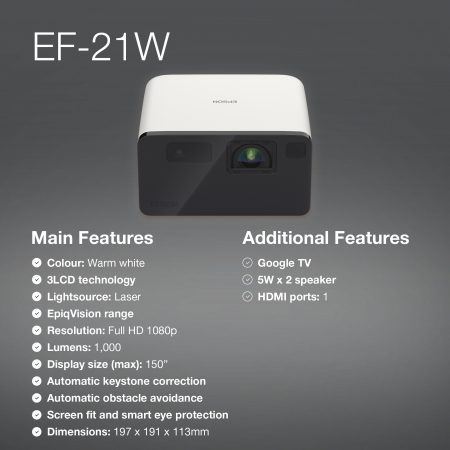 EpiqVision Mini Laser serisinin bir parçası olan bu projektörün şık ve sofistike tasarımı kolayca diğer etkileyici özelliklerinin önüne geçebilir. Akıllı çözümler ve Bluetooth bağlantılı 2x 5W hoparlörler ve kolay kurulum ile evde veya hareket halindeyken anında eğlence için mükemmel çözümdür. Epson’un 3CLD teknolojisi sayesinde, görüntüler daha parlak ve canlı görünür.