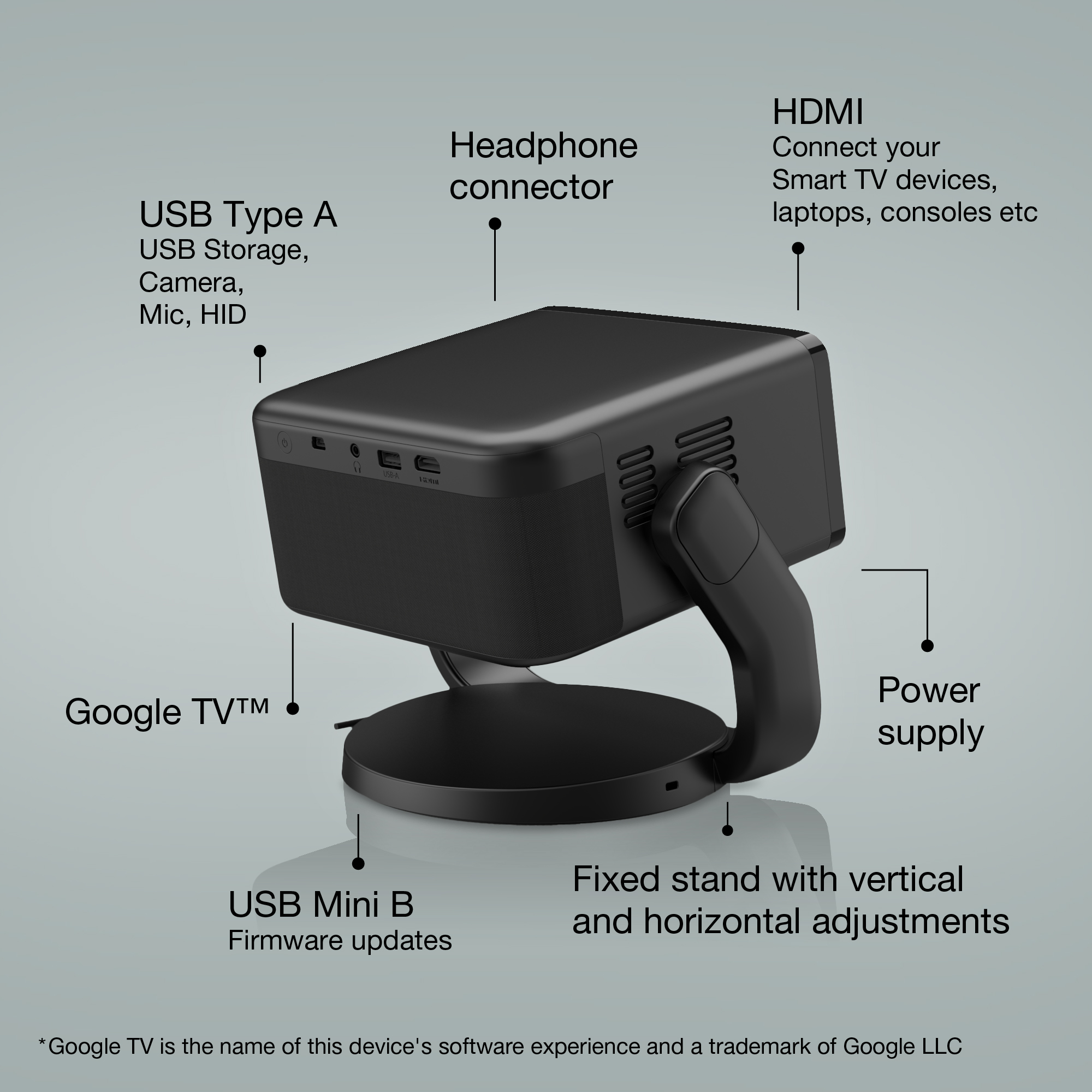 Yayınladığınız her şey. Hepsi tek bir ekranda. 400.000’den fazla* filme ve TV dizisi bölümüne tek bir yerden erişin. Google TV™, en sevdiğiniz içeriği uygulamalarınız ve abonelikleriniz arasında sunar ve yalnızca sizin için düzenler. Google Asistan’dan filmler bulmasını, sesinizi kullanarak* uygulamaları yayınlamasını, müzik çalmasını ve projektörünüzü kontrol etmesini isteyin. Google Cast* ile telefonunuzdan veya tabletinizden doğrudan projektörünüze filmler, programlar, fotoğraflar ve daha fazlasını kolayca oynatın. Dahili 5W Bluetooth hoparlörler, görsel bir ekranla veya görsel bir ekran olmadan kullanılabilir.